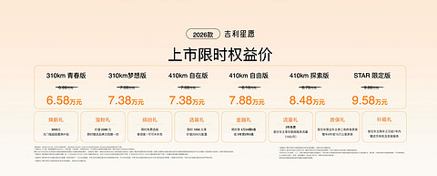 10月10日,2025吉利汽车用户大会在杭州成功举办。活动现场,2026款吉利星愿也正式宣布上市,新车共推出6个版型,限时权益售价区间为6.58万元-9.58万元。同时,官方还推出了焕新礼、宠粉礼、缤纷礼、选装礼等八重限时购车权益。