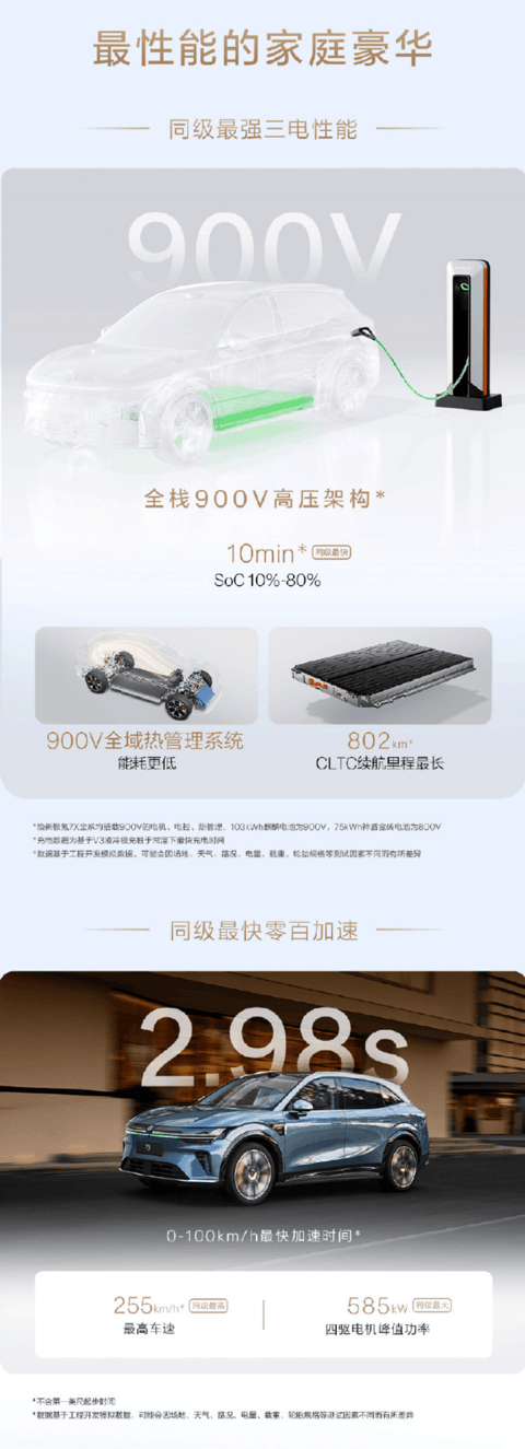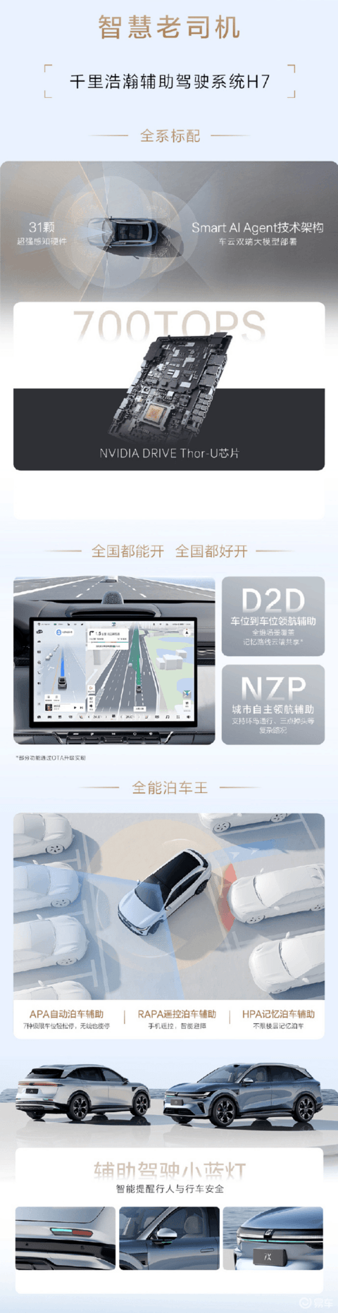 新车搭载全栈900V高压系统,支持10分钟从10%充至80%,CLTC续航最长可达802km。双电机版本零百加速仅2.98秒,四驱电机峰值功率585kW。智能驾驶方面,标配千里浩瀚辅助驾驶系统H7,配备31颗感知硬件及英伟达Drive Thor-U芯片,支持车位到车位领航辅助等功能。