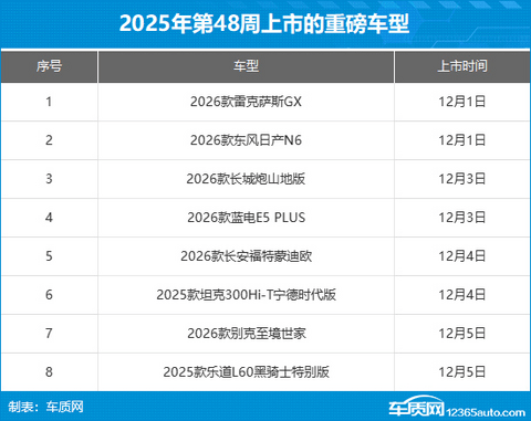 2025年第48周(12.1-12.7)上市新车汇总