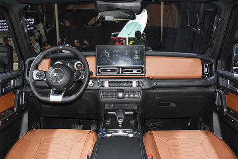 内饰方面,整体延续硬派SUV的设计语言,在强化科技感的同时,注重实用性与操作便捷性,空调与越野功能控制区都配备了实体按键布局。配置方面,新车配备10.25英寸全液晶仪表与12.3英寸中控屏组成的双联屏,支持导航及手机互联功能,并全系标配前/后驻车雷达与360°全景影像。