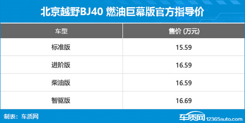 1月27日,2026款北京越野BJ40燃油巨幕版正式上市,新车共推出4款配置,官方指导价15.59-16.69万元,综合焕新价13.29-14.39万元。同时,官方还推出了全系7重礼。作为新增车型,其主要针对配置进行了升级。