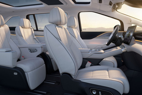 内饰方面,新车主打简约舒适,配备17.3英寸中控屏和10.25英寸仪表屏。车机内置高通骁龙8295P芯片和图灵AI芯片,支持多种互联方式、六区域语音唤醒识别等功能。同时,全系标配三排电动三折叠座椅,第三排支持180度躺平,实现全员舒适满分表现。