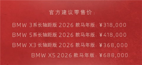 宝马官方正式推出旗下3系长轴距、5系长轴距、X3长轴距及X5四款车型的2026款马年版,新车全系融入了专属中国马年的设计元素。其中3系长轴距马年版31.8万元,5系长轴距马年版41.8万元,X3长轴距马年版36.8万元,X5马年版68.8万元。