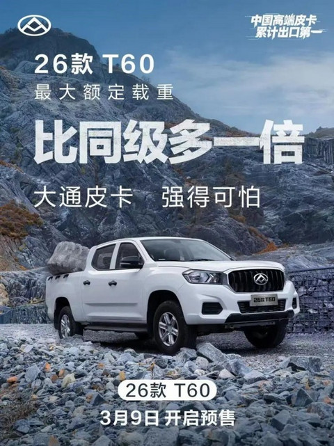 近日,上汽大通MAXUS官方宣布旗下2026款T60皮卡将于3月9日正式开启预售。据悉,新车将在动力、空间以及装载能力方面有明显提升。