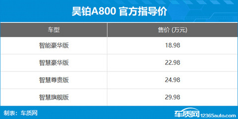 2026年3月4日,广汽昊铂官方宣布旗下全新中大型车――昊铂A800正式上市,共推出4款车型,官方指导价区间18.98-29.98万元,限时置换补贴价16.48-27.48万元。新车搭载增程式动力系统,配备华为乾��ADS V4.1辅助驾驶系统、鸿蒙座舱HarmonySpace 5等配置。