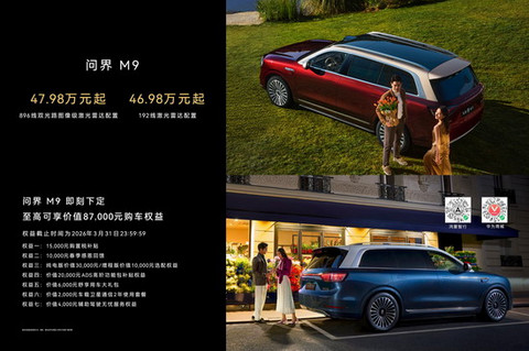 搭载全新一代激光雷达的问界M9,已于2026年3月4日开启预定,建议零售价47.98万元起,即刻下定,至高可享价值87,000元购车权益,权益截止时间为2026年3月31日23:59:59。