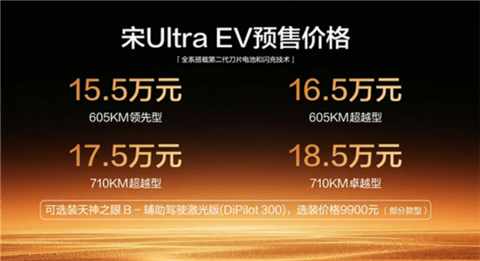 在比亚迪第二代刀片电池暨闪充技术发布会上,比亚迪全新B级纯电SUV宋Ultra EV开启预售,新车共推出四款车型,预售价区间为15.5-18.5万元。