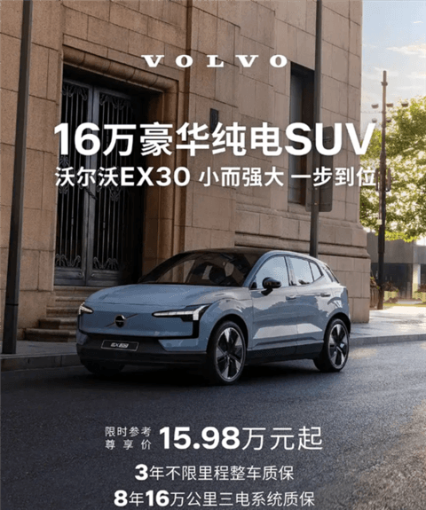 日前,新款沃尔沃EX30豪华纯电SUV正式上市,新车推出3款配置,厂商指导价20.38-25.58万元,限时参考尊享价15.98-20.98万元,入门版配置大幅提升,进一步强化市场竞争力。购车权益方面,新款EX30提供3年不限里程整车质保、8年16万公里三电质保、3年免费救援及4年媒体流量,兼顾豪华品质与用车保障,以高性价比切入豪华纯电小型SUV市场。
