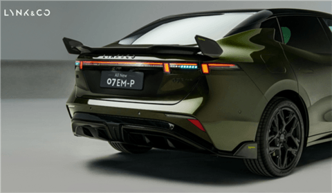 新车基于领克07 EM-P打造,长宽高为4835/1900/1480毫米,轴距为2843毫米,细节方面优化升级,提供全新“鎏光金”车色,前包围两侧增加了大尺寸进气口,尾部也增加了后唇设计,最大的亮点是搭载了大尺寸碳纤维尾翼,造型更加拉风动感。