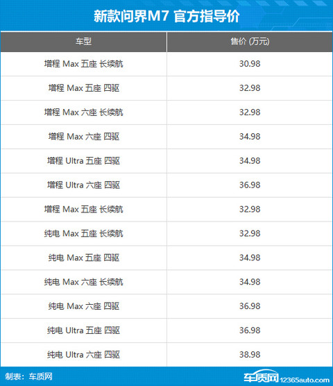 2026年3月23日,新款问界M7正式上市。新车整体设计变化不大,仅新增1款外观配色,同时配置上得到调整与提升,综合竞争力更强。此次上市新车共13款车型,售价区间为30.98-38.98万元。