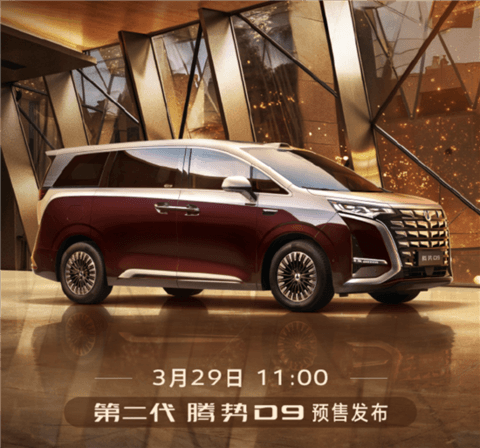 近日,腾势官方表示,新款腾势D9将于3月29日正式预售发布。据悉,新车搭载第二代刀片电池和闪充技术,提供插混和纯电车型。其中,插混车型纯电续航里程有望突破400km,纯电车型最高续航里程达800km。