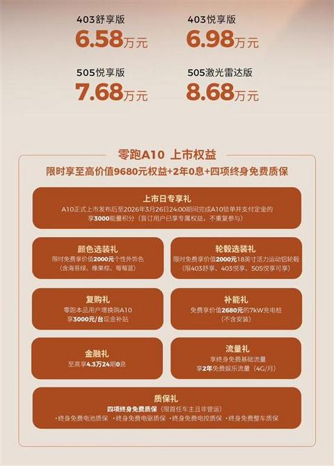 3月26日,零跑旗下全新纯电小型SUV零跑A10正式上市,此次共推出4款车型,售价6.58-8.68万元。动力方面,新车搭载单电机,CLTC纯电续航里程提供403km和505km两种选择。与此同时,官方还推出了限时享至高价值9680元权益+2年0息+四项终身免费质保上市权益。