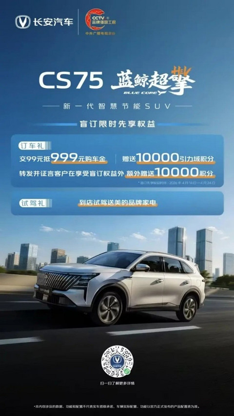 近日,长安汽车宣布第四代CS75PLUS蓝鲸超擎正式开启盲订,并将于4月24日北京国际车展进行全球发布。同时,预订用户可限时享受:试驾送美的品牌家电、享交99元抵999元购车金、赠送10000引力域积分以及客户在社交平台发布提车作业再享额外赠送10000引力域积分的四大购车礼遇。