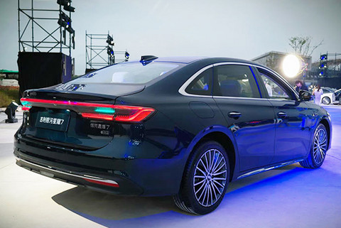 车身侧面线条修长流畅,采用溜背式车顶设计,侧窗边缘辅以精致镀铬饰条,搭配19英寸“星辉”密辐式轮毂,营造出兼具运动感与豪华感的视觉效果;车尾配备小型鸭尾,进一步强化运动氛围。值得一提的是,新车还配备智驾“小蓝灯”,增添不少科技氛围。