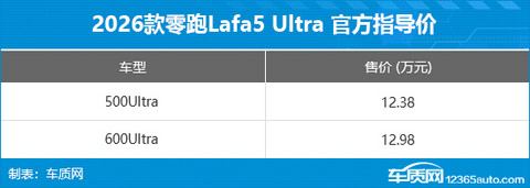 2026年4月24日,在北京车展现场,零跑Lafa5 Ultra正式上市。新车共推出2款车型,官方指导价12.38-12.98万元,上市限时惊喜价11.88-12.48万元。此外,官方还推出复购礼、补能礼等多项购车礼遇。