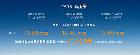 第四代CS75PLUS蓝鲸超擎发布抢订价:交1999元至高享10000元现金红包,蓝鲸超擎尊享型11.69万元、蓝鲸超擎旗舰型12.49万元、蓝鲸超擎天枢领航型13.49万元,并特别推出蓝鲸超擎真香型一口价10.99万元(不享受现金礼、置换礼、金融礼);除蓝鲸超擎真香型外,购其他配置车型用户可享五大限时购车权益:置换礼:置换至高11000元(本品/非本品8000元,长安CS75系列车型置换限时叠加3000元补贴);金融礼:5万36期0息、0首付、5年低息超长贷;保养礼:限时赠送3年或6次基础保养;质保礼:首任非营运车主HEV混动系统核心部件终身质保;流量礼:基础流量免费,娱乐流量3年免费(6G/月)。