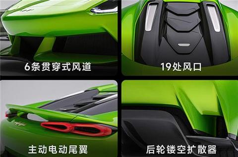 新车前脸采用锋豹之眼前大灯样式,全碳车身,姿态低趴,使用非常张扬的剪刀门,同时应用了大量的空气动力学套件,拥有19处风口,车尾采用无限之环尾灯,新车还采用主动电动后扰流板,后轮镂空扩散器。