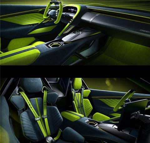 车内配战斗座舱,采用环抱式设计,灰绿撞色相当高调,并配备可伸缩方向盘、机械按键、一体化运动座椅、四点式安全带