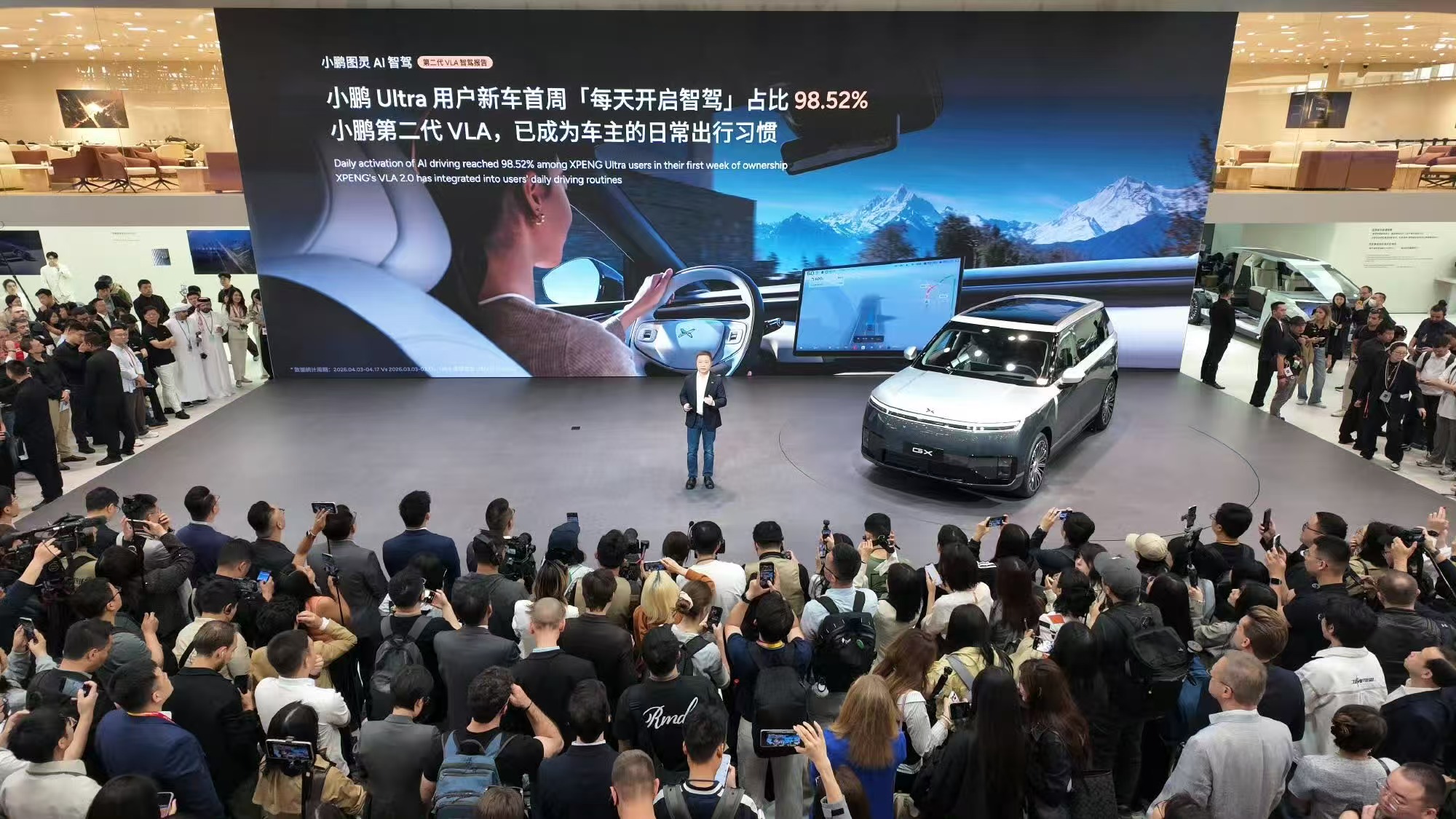 过去几年,智驾行业的竞争一直困在硬件军备竞赛里。激光雷达装了几颗、探测精度多高、自动驾驶芯片峰值算力多少,曾是衡量智驾水平的核心指标,城市NOA功能的普及更是把这场堆料大战推向了高峰。 在本届北京车展上,时代周报记者注意到,智驾的竞争逻辑正在悄然改变。 从自主车企扎堆发布自研大模型成果,到宝马、奔驰、奥迪等合资品牌集体开启智驾本土化补课,再到头部智驾方案商纷纷亮出新技术路线。整个行业的竞争已经从硬件堆料,转向AI大模型底层能力和规模化落地的博弈。 自主车企死磕自研 在这场大模型主导的智驾变革中,头部自主车企早已迈过了“用别人方案”的阶段,自研成了这届车展的最大亮点。 蔚来(09866.HK)在车展上正式发布了中国首个面向自动驾驶的世界模型——蔚来世界模型(NWM)。蔚来创始人、董事长兼CEO李斌在采访中直言,智能电动车行业正陷入“迭代太快、供需失衡、盈利承压”的困境,而全栈自研是平衡技术迭代与成本控制的关键路径。 小鹏汽车(09868.HK)在车展上首次披露了第二代VLA智驾报告的关键结论。据介绍,其自研大模型已实现感知、决策、规控全链路端到端打通,极端场景的接管率较上一代方案下降了62%。小鹏集团董事长兼CEO何小鹏在发布会上表示,第二代VLA的落地意味着高阶智驾已经从“尝鲜功能”蜕变为消费者购车的核心决策因素,数据显示,小鹏全系Ultra用户中,新车首周每天开启智驾的比例已达98.52%,智驾系统真正成了日常出行离不开的刚需。
