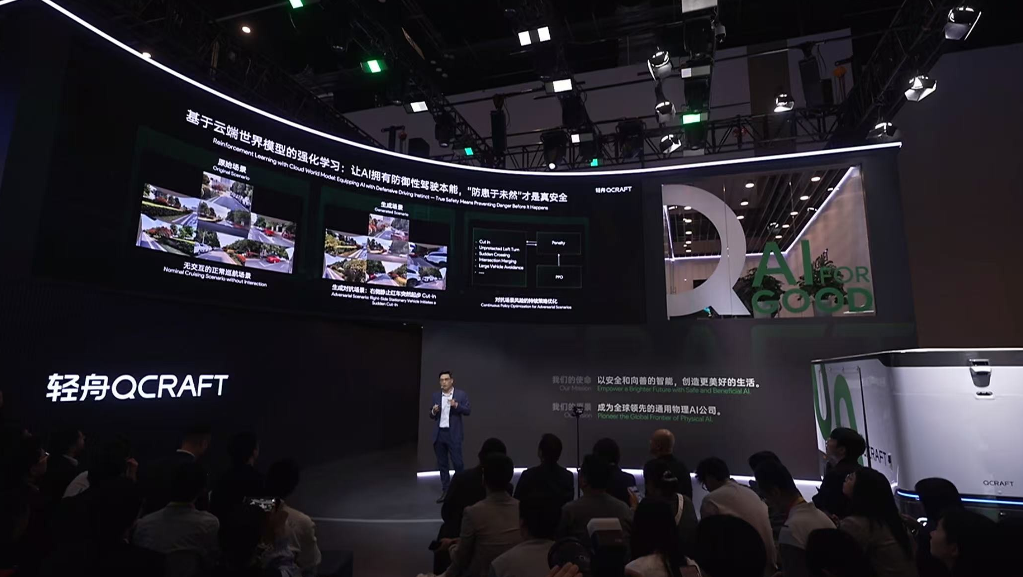 轻舟智航车展发布会 图源:品牌官方 轻舟智航在车展首日推出了“世界模型+强化学习”的全新方案,同时宣布公司战略重心从“无人驾驶”升级为“通用物理AI”。轻舟智航联合创始人、董事长兼CEO于骞在发布会上表示,“世界模型加强化学习是连接数字与物理世界的核心桥梁,也是通往通用物理AI的必经之路。”行业专家认为,大模型给智驾带来的不是单点体验升级,而是一场底层范式变革。当智驾系统的核心从人工规则转向数据驱动的大模型,行业的竞争门槛也从硬件成本控制,转向了数据闭环能力、大模型训练能力与工程化落地能力的综合比拼。 告别参数内卷后,智驾行业的未来走向也愈发清晰。 规模化量产是大模型迭代的核心护城河。同时,大模型智驾的成本下探已是必然趋势,高阶智驾将快速从高端车型向10万至20万级主流市场普及。此外,大模型决策的可解释性、数据安全与合规,也将成为企业必须跨越的关键门槛。 本网站上的内容(包括但不限于文字、图片及音视频),除转载外,均为时代在线版权所有,未经书面协议授权,禁止转载、链接、转贴或以其他 方式使用。违反上述声明者,本网将追究其相关法律责任。如其他媒体、网站或个人转载使用,请联系本网站丁先生:news@time-weekly.com