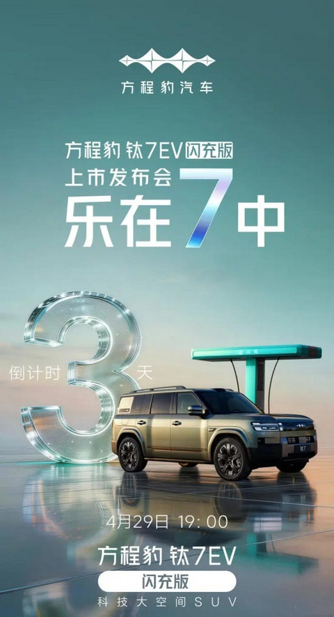 近日,方程豹汽车正式官宣,旗下全新方盒子纯电SUV――钛7 EV闪充版将4月29日19:00在比亚迪深圳全球总部举行上市发布会,全平台同步直播。新车此前已开启预订,预售价格区间锁定在22―25万元。