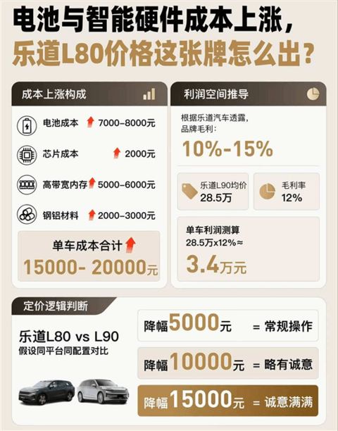 近日,乐道L80官图正式发布,新车定位五座大型SUV。据官方透露,在成本大幅上涨的情况下,该车售价仍有望在现款乐道L90的基础上下调1-1.5万元。
