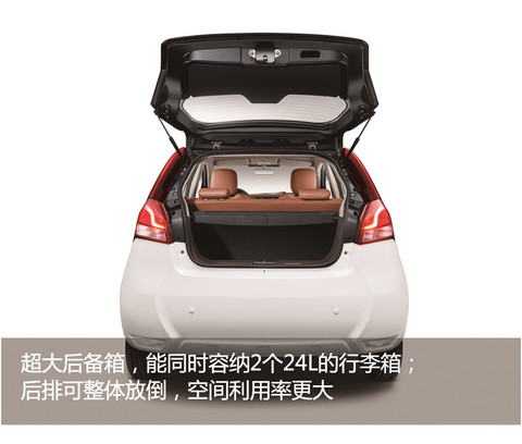 这款车拥有2360mm的超长轴距,配合凹形设计的前排座椅,打造出同级车中最大的乘坐空间。车辆内部经过科学、人性化的设计,配备有非常多的储物格槽,比如车门上的储物格可以放下一个脉动大小的水瓶,实用性特别高,实现了小车大空间的设计理念。后备箱空间也不容小觑,如果有旅行需求,后备箱可同时容纳2个24L的行李箱。若你有更大的载物需求,云100plus的后排座椅支持整体放倒,可瞬间提升车辆的储物空间。