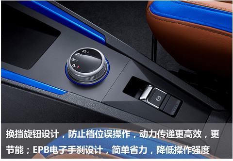 全新升级的云100plus采用了极具品质的换挡旋钮设计。对比前代产品的换挡杆,云100plus的换挡旋钮让人驾驶更得心应手。防止档位误操作的同时,动力传递更高效,更节能。在换挡旋钮的后方是EPB电子手刹,设计美观方便,也节省空间。停车制动由一个按键替代了驾驶者的用力拉驻车制动手柄,简单省力,女司机操作起来会更轻松方便。