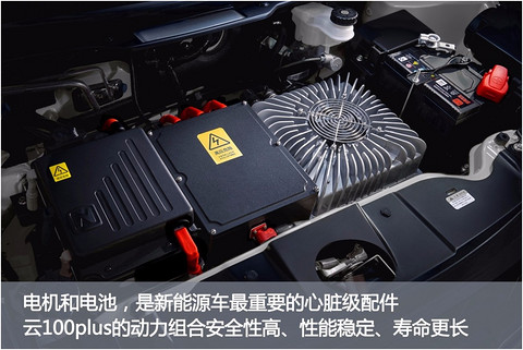 云100plus采用世界先进级别的三相交流异步电动机,结构简单、维修方便,安全性高、电机性能稳定性好、不易衰减。搭配行业主流的三元锂离子电池,具有能量密度高,使用寿命长的特点,而且稳定性更高,也更方便安装和维护。这个高效的动力组合,最大功率达到27KW,最大扭矩足140N·m,最大车速突破了100km/h,最大续航里程可达200km,表现十分优秀。