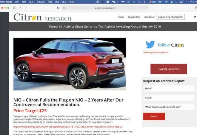 主要来自著名做空机构 Citron 。他们发了篇报告,说蔚来股价应该是 25 美元,而不是现在 40 美元以上的高位。