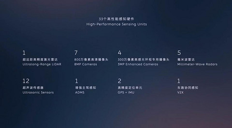 ES7 同样采用瞭望式的传感器布局,周身共拥有33 个高性能传感器,包含 1 个1550nm 激光雷达、7 个 800 万像素摄像头、4 个 300 万环视摄像头、5 个毫米波雷达、12 个超声波雷达、2 个高精度定位单元、1 个车路协同感知以及 1 个增强主驾感知。