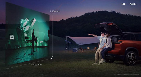 让人惊喜的是, AR/VR 虚拟现实技术也来到了 ES7 上。官方说只要配上蔚来与NREAL联合开发的专属 AR 眼镜,用户在车内即可观看视距 6米、等效 201 英寸的虚拟超大屏幕。