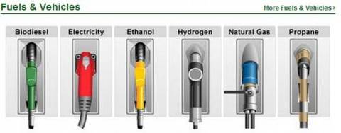 美国的”替代燃料”从左到右分别是:生物柴油,电,乙醇,氢气,天然气,丙烷