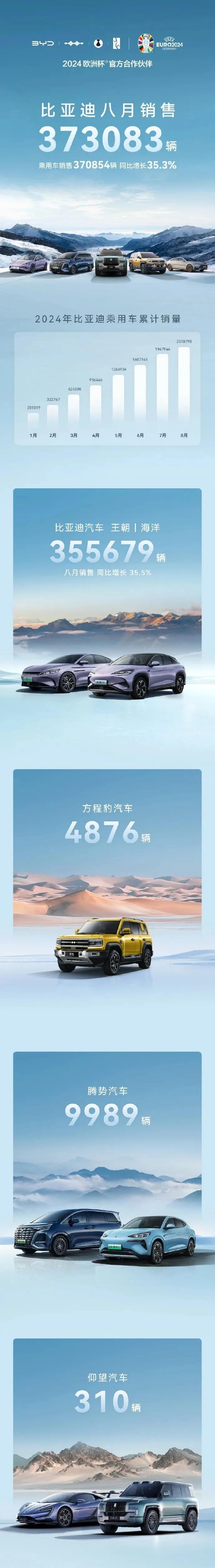 按照事业群划分,王朝网+海洋网(也就是比亚迪主品牌)合计销量 355679 台;方程豹销量 4876 台;腾势销售 9989 台;仰望销售 310 台。