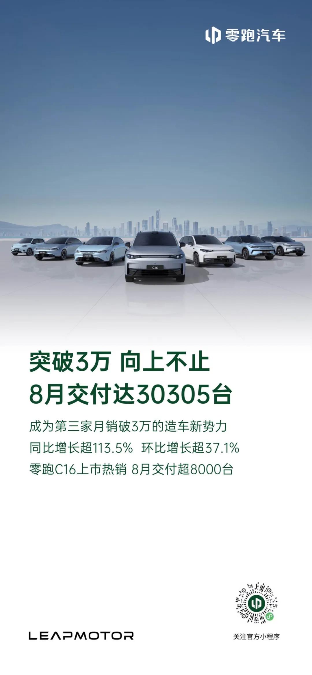 零跑 8 月份实现了环比 37.5% 的超高增速,交付量达到了 30305 台。
