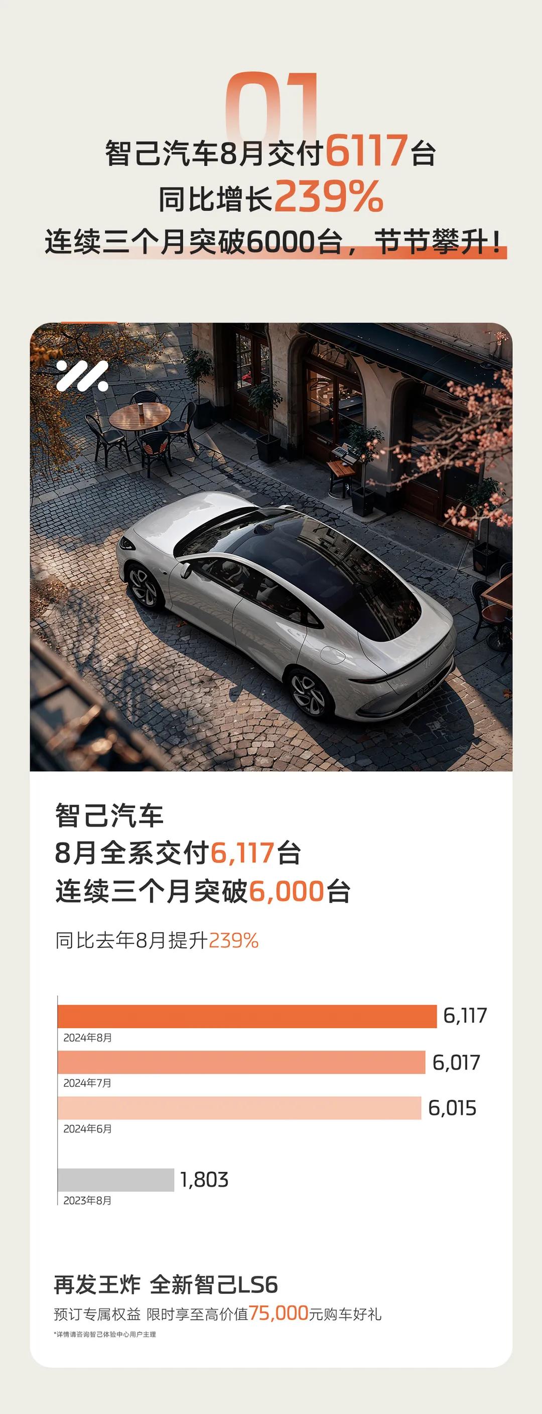 智己汽车 8 月份交付 6117 台,同比增长 239%。