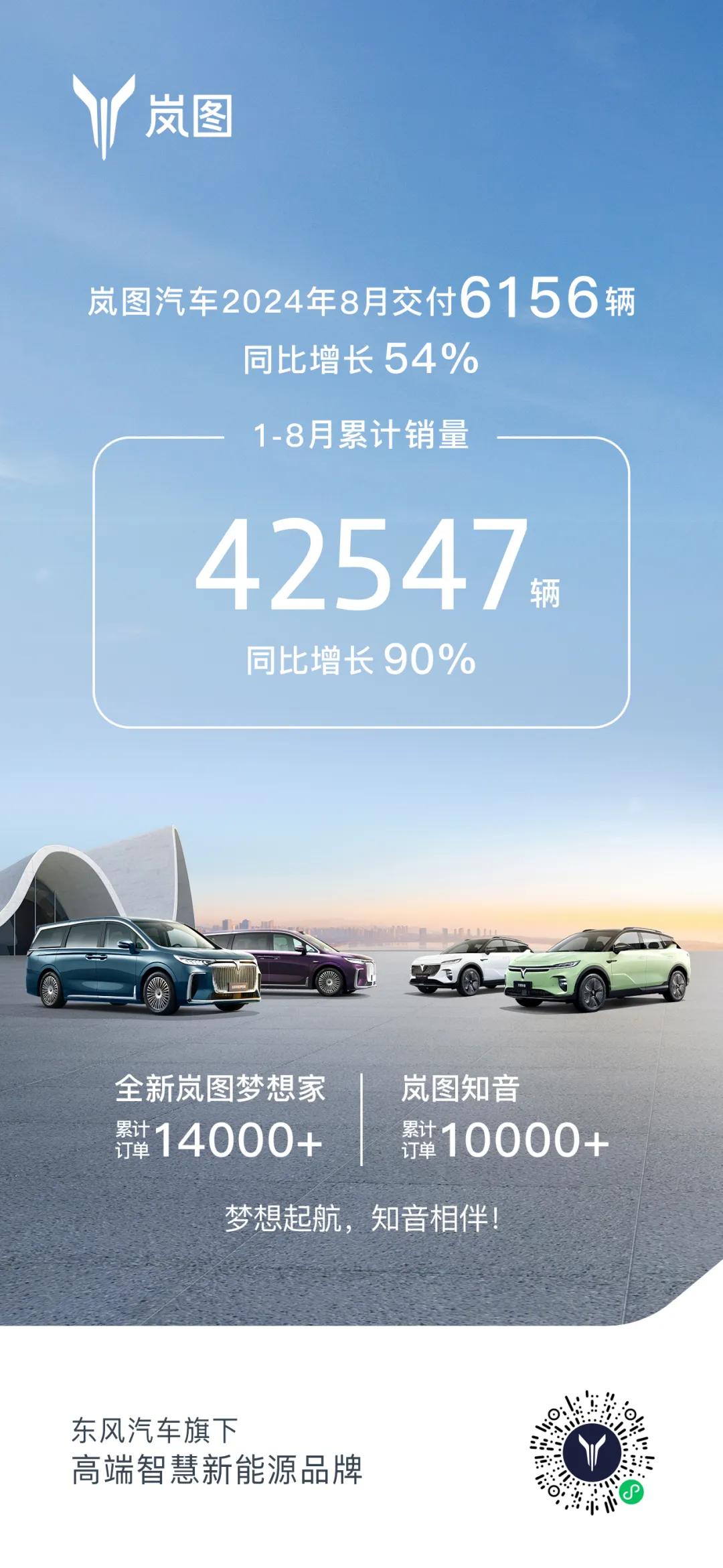 8 月份,岚图汽车交付 6156 台汽车,同比增长达到了 54%。