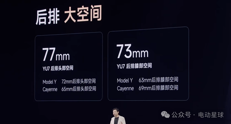 设计方面,与 SU7 同源的设计语言已经得到市场的接受和认可。结合电动星球内粉丝群的讨论,大家对小米 YU7 的空间表现颇为关心,而发布会上雷军也心领神会,初步给出了还算能让人满意的回答。