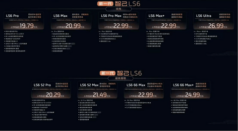 首先是多线并行的配置定价:新款 LS6 一共划分出了 Pro、Max、Pro Max、Max+和 Ultra 五个配置梯队,价格覆盖 19.79 万至 26.99 万元。