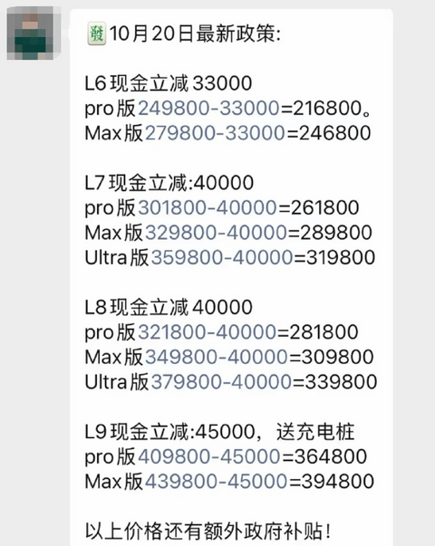 李想还是有焦虑的。L系列目前有3.3~4.5万元的现金优惠政策,L6最低只要21.68万元。