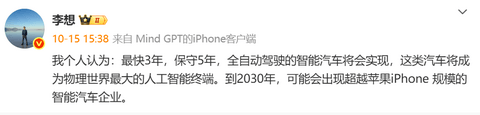 李想认为,最快 3 年、保守 5 年实现全自动驾驶的智能汽车。
