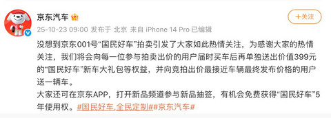 10月23日,京东汽车官方微博账号发布消息称,没想到京东001号“国民好车”拍卖引发了大家如此热情关注,为感谢关注,将会向每一位参与拍卖出价的用户届时买车后再单独送出价值399元的“国民好车”新车大礼包等权益,并向竞拍出价最接近车辆最终发布价格的用户送一辆车。