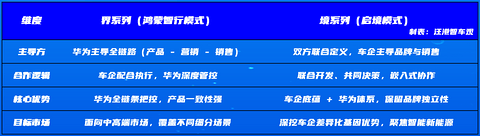 在这一模式下,华为与赛力斯、江淮、北汽、奇瑞、上汽等厂商合作,其中,华为主导从产品定义到渠道运营的全过程,主要是在中高端市场寻求突破。