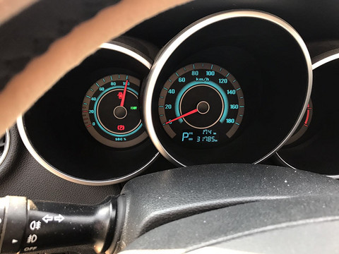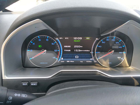 逸动的仪表台我感觉和EU260的有些相似,都是这种炮筒式的。左侧是SOC指示,中间是车速表,充满电时续航里程显示174KM。据车主介绍,平时在家慢充充满的时候一般会显示150-160KM左右的数字,一般在外面快充充满时续航会多显示出来一点儿,所以此次充满显示的174KM也是正常的。