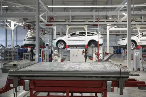 特斯拉蒂尔堡工厂的车间中放置的电池组