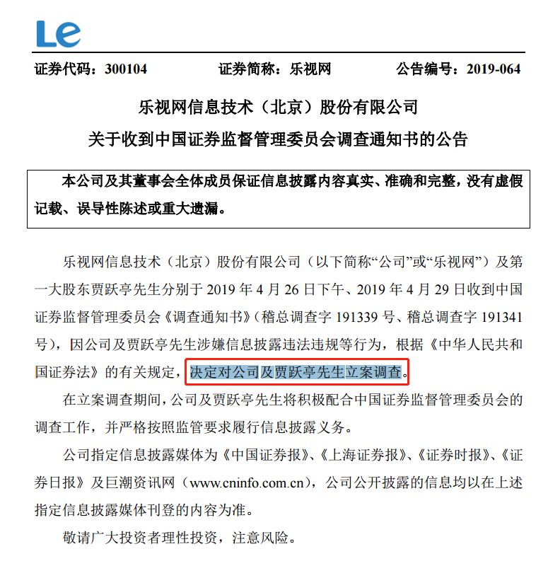 乐视网29日晚间公告,公司及第一大股东贾跃亭分别于2019年4月26日下午、2019年4月29日收到中国证监会《调查通知书》,因公司及贾跃亭涉嫌信息披露违法违规等行为,根据《中华人民共和国证券法》的有关规定,决定对公司及贾跃亭立案调查。