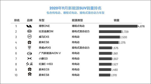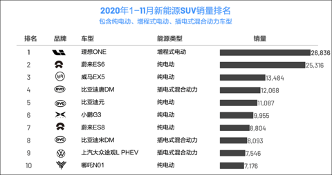 2020年1-11月,理想ONE销量为2.68万,居新能源SUV销量榜首: