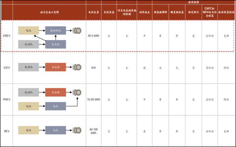 电动车分为这么几种:ICEV内燃机汽车,PHEV插电式混合动力汽车,EREV增程式电动汽车,BEV纯电动汽车。技术路径的不同之处见下图。