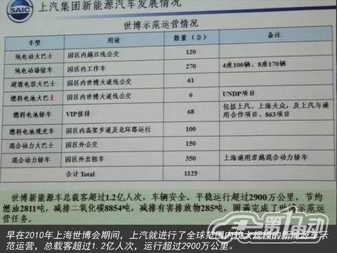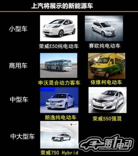 据悉,此次展出的主要展品包括:混合动力方面,荣威新750Hybrid混合动力轿车,荣威550插电式混合动力轿车,申沃混合动力城市客车;纯电动方面,荣威E50纯电动轿车,上海通用赛欧SPRINGO纯电动轿车,上海大众朗逸纯电动轿车;燃料电池方面,自主品牌新一代轻量化燃料电池轿车。