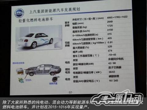 新能源车也是上汽未来发展的重点,上汽集团董事长胡茂元在日前的博鳌亚洲论坛表示,未来新能源汽车占整车的比重为10%-15%。其实,早在”十二五”初期,上汽集团就表示,公司在国内新能源车市场中要占据20%的份额,与上汽目前在国内的市场份额基本一致。上汽相关负责人对网通社表示,上汽集团所称的新能源车,是一切节能减排技术车型,也包括搭载启停技术的车型。在此次品鉴会上,上汽集团新能源车事业部总监黄承东再次重申,公司新能源”十二五”总体目标是:达到国内新能源汽车20%市场占有率;同时,通过实施节能和新能源汽车战略,快速降低公司平均燃油消耗值,达到国家2015年和2020年平均燃油消耗量限值目标。